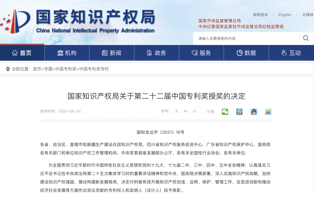 2021年6月24日,國家知識產權局在《國家知識產權局關于第二十二屆中國專利獎授獎的決定》中公布本屆知識產權相關獎項名單。其中,神美科技-復合型凈水劑技術榮獲中國專利優秀獎。